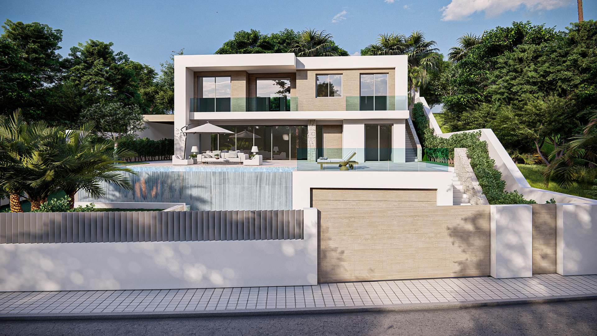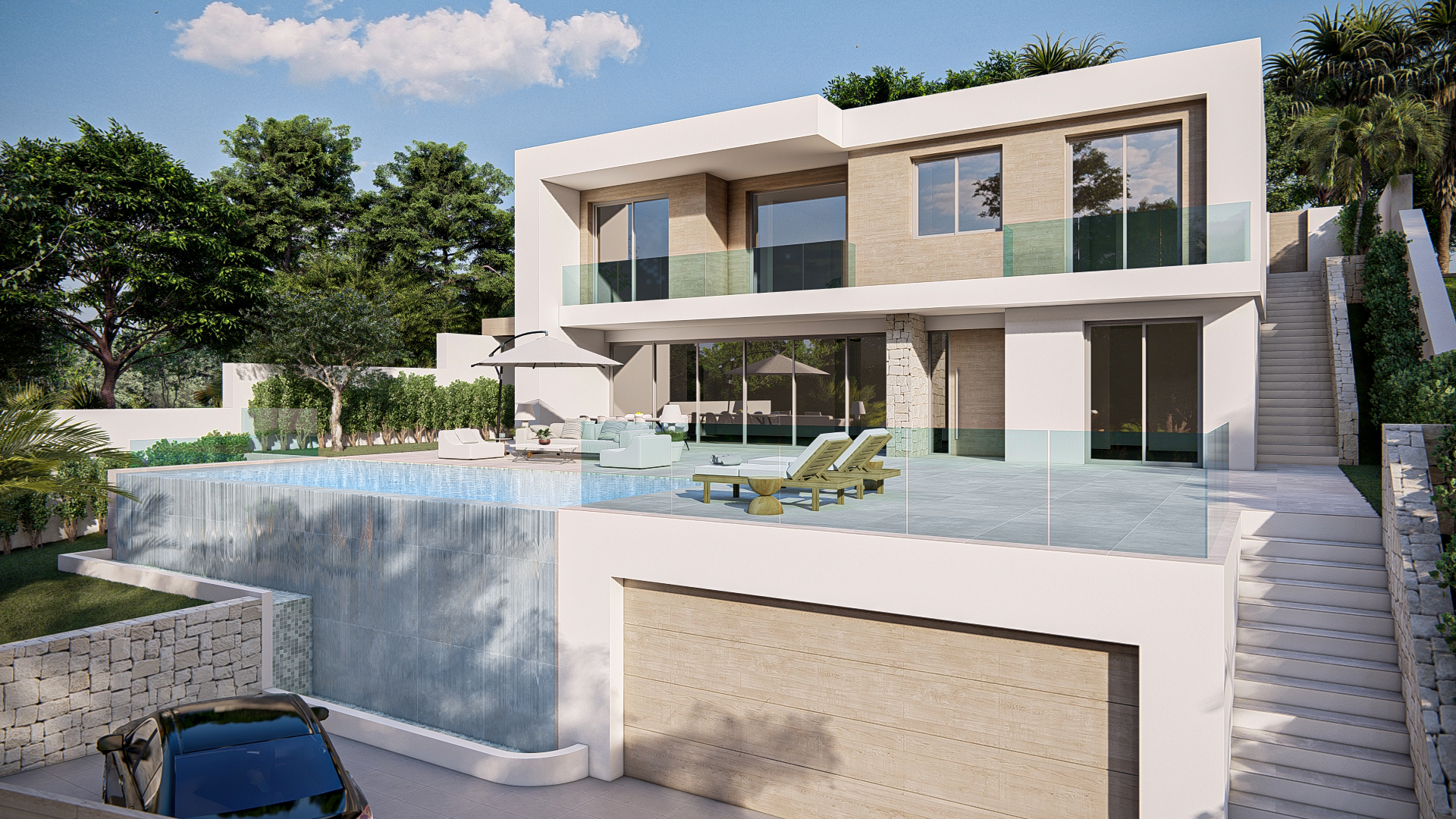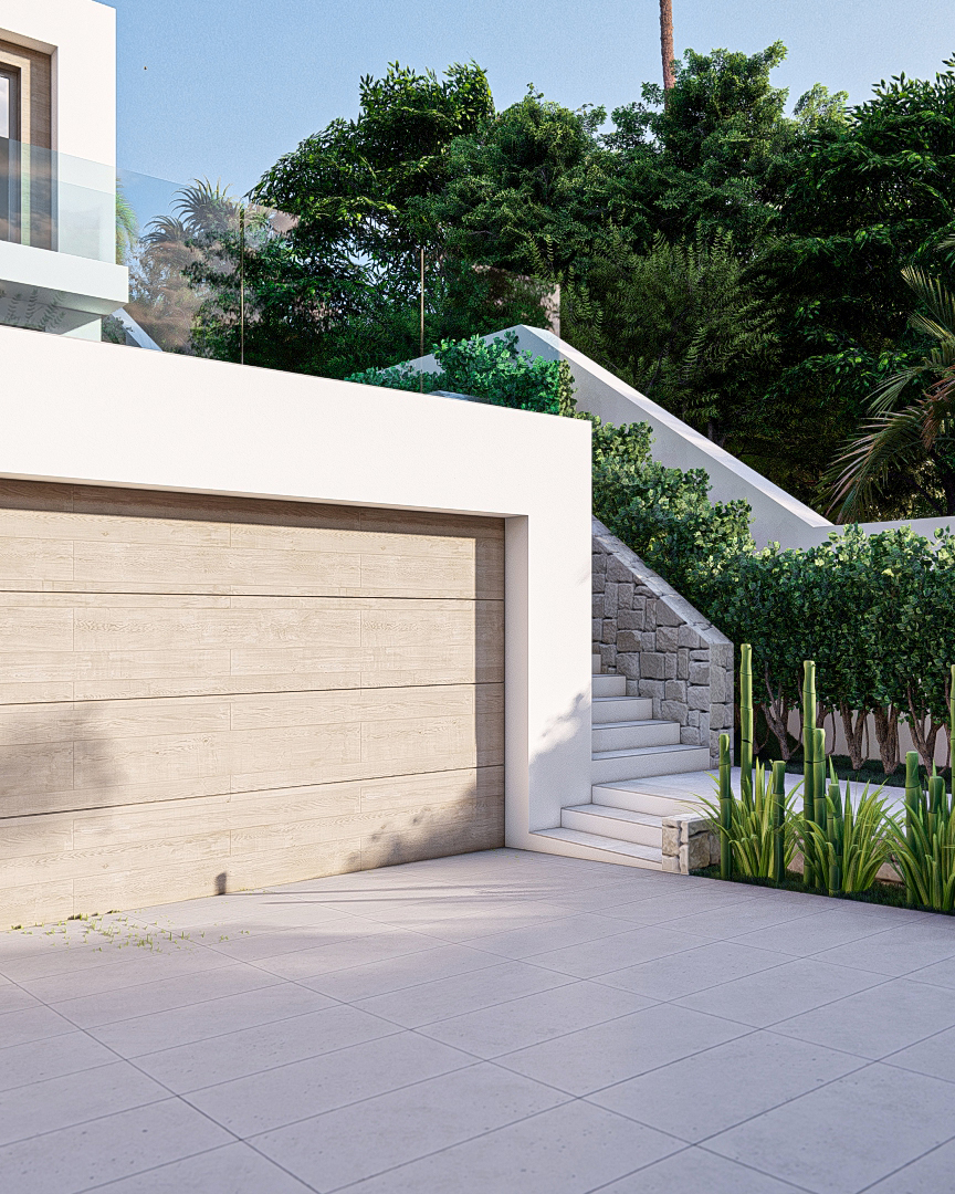 fusión de elegancia y calidez con un diseño predominante blanco, acentuado por la madera clara y la piedra. Los amplios ventanales inundan los espacios interiores de luz natural, creando una atmósfera luminosa y confortable.